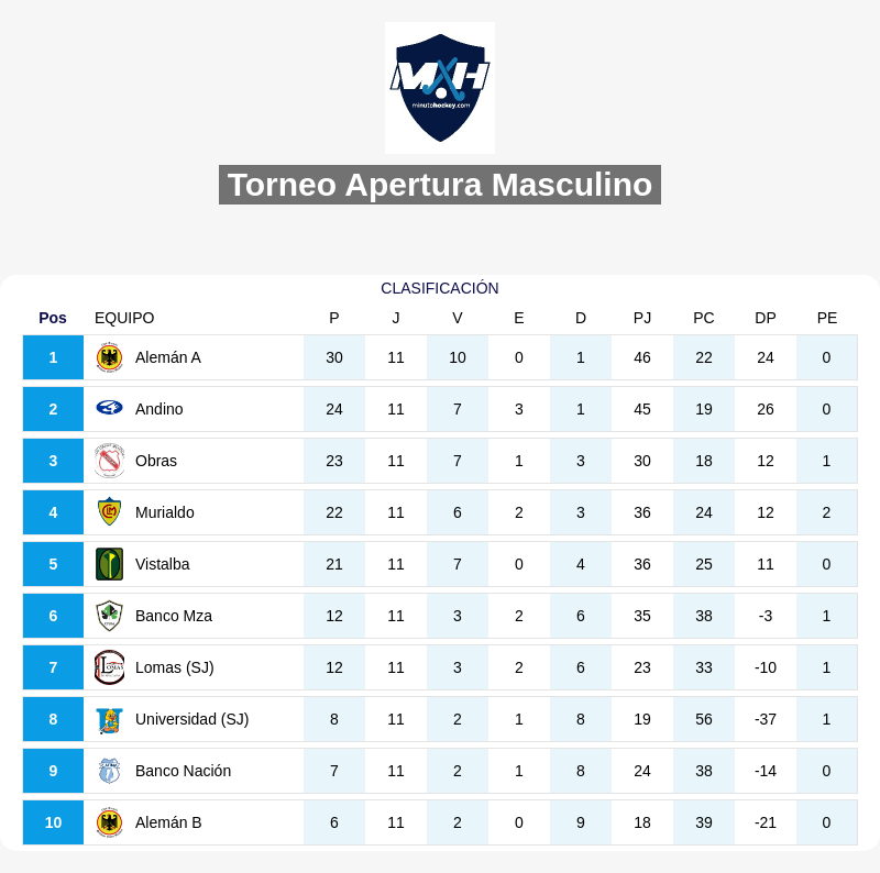 La rama masculina también tuvo su reanudación del torneo Apertura con la disputa de la 11ª fecha, que no tuvo empates y donde Alemán A continúa en lo más alto de las posiciones.